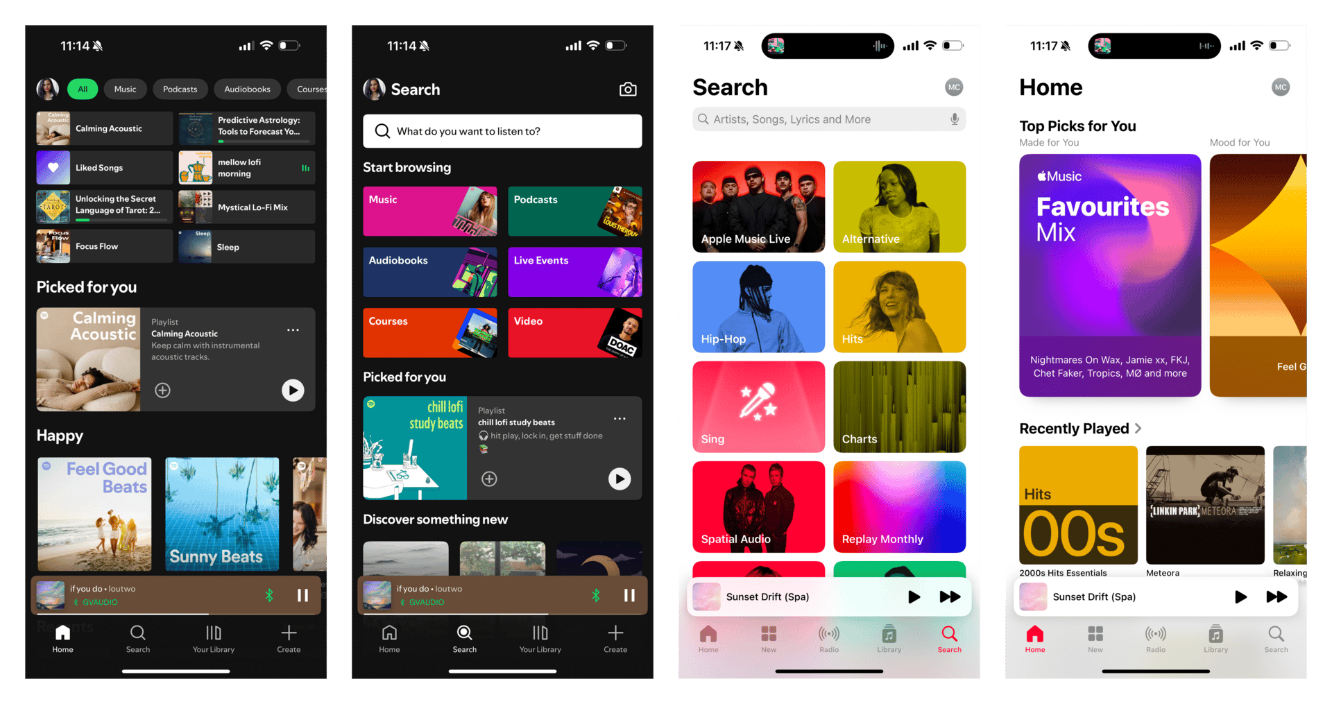 Notice how they present the same content through different lenses: mood-based playlists, activity-based suggestions, recently played, and contextual recommendations.